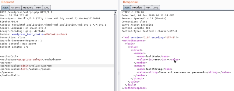 </methodCall>Also there is a faster way to brute-force credentials using system.multicall as you can try several credentials on the same request:
