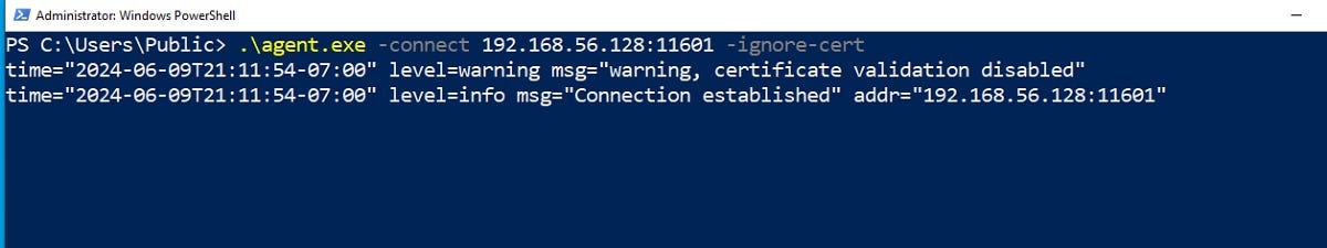 ./agent.exe -connect <IP of First Pivot Point>:11601 -ignore-cert