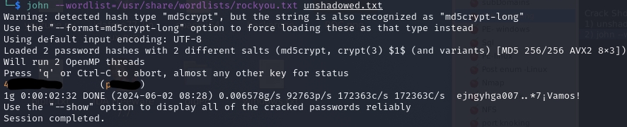 unshadow passwd shadow > unshadowed.txt john --wordlist=/usr/share/wordlists/rockyou.txt unshadowed.txt